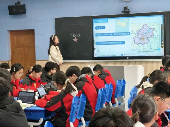 第一节课是由周言夕老师在八13班执教的地理课《首都北京》。周老师以“千年古都—现代化大都市—古今融合”为主线,带领学生穿越时空,多维度解读这座历史名城的独特魅力。课堂上,周老师通过翔实的史料与生动的影像,展示了北京作为六朝古都的厚重底蕴;又结合城市规划与经济发展,剖析了北京作为国家首都的现代职能。课程最后,周老师引导学生思考如何在城市发展中实现历史传承与创新突破的平衡,巧妙揭示了北京“古今交融”的城市特质。整节课逻辑清晰、层层递进,既夯实了学生的地理学科素养,也激发了他们对家国文化的认同感。