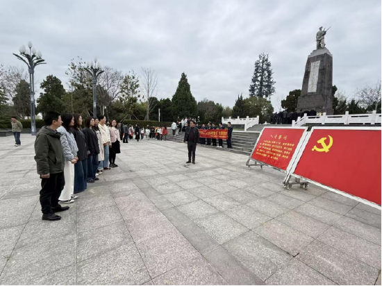 烈士陵园内庄严肃穆,党员教师整齐列队,向革命烈士纪念碑敬献鲜花、肃立默哀,深切缅怀在半塔保卫战中英勇牺牲的革命先烈,追思他们的崇高精神与不朽功勋。在朱世平的领誓下,全体党员面向鲜红党旗,高举右拳,重温入党誓词。铿锵有力的誓言回荡在纪念碑前,进一步强化了党员的身份意识与责任担当。