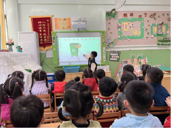大班年级组的孩子们变成环保小卫士。老师扮演“环保小站长”,创设宣传情境,通过图片和卡片引导幼儿区分四类垃圾。孩子们判断垃圾投放方向,并合作制作垃圾分类流程图。模拟宣传中,他们佩戴胸牌、拿小喇叭向小班弟弟妹妹宣传分类方法,喊出口号:“垃圾分类小小手,干净环境大家有!”通过活动,树立了环保小卫士责任意识。