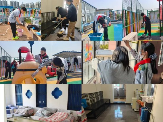 仪式结束后,队员们迅速化身小小志愿者,主动开展志愿服务工作。大家分工协作、认真细致,重点对顶楼大露台、家长公共休息区进行全面清扫,对公共区域的桌椅、地面进行细致擦拭与整理,不放过任何卫生死角,用实际行动为就医家庭打造更加整洁、舒适的居住与休息环境,充分展现了合肥市第四十二中学学子文明有礼、踏实肯干、积极向上的良好精神风貌。