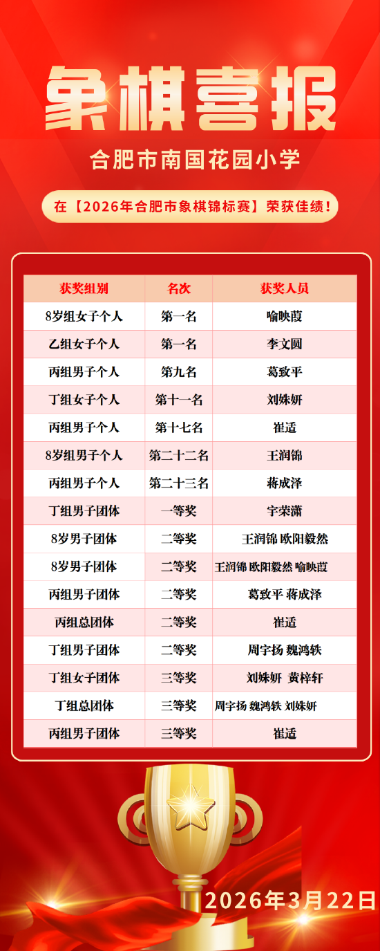 关注2026年3月21日至22日,由合肥市体育局、合肥市体育总会主办,合肥市全民健身发展中心、合肥棋院承办,合肥市象棋运动协会协办的2026年合肥市象棋锦标赛在合肥市全民健身中心合肥棋院圆满落幕。合肥市南国花园小学代表队积极参与,小棋手们在个人与团体赛事中表现卓越,斩获个人冠军2项、团体奖多项,以优异成绩彰显了学校在棋类教育领域的扎实成果。