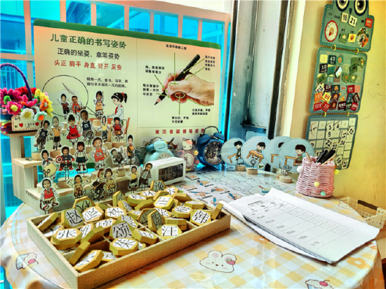 此外,四里河畔园立足幼小衔接关键阶段,聚焦幼儿语言发展,在语言区深度渗透听说读写核心经验。通过识字小报、汉字寻宝、生活识字角等多种形式,引导幼儿在生活中发现汉字、认识汉字,激发前阅读与前书写兴趣。同时,在晨间自主签到环节,园区投放数字时钟、指针时钟、汉字描红等不同层次材料,将语言发展、时间认知、前书写练习自然融入一日生活,扎实有序推进幼小衔接各项工作。
