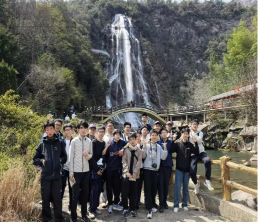 午餐后,队伍抵达彩虹瀑布,开启《彩虹形成原理》主题研学探究。瀑布飞泻而下,水雾漫天,阳光穿透水雾,一道绚丽的彩虹横跨峡谷。高高飘扬的校旗下,导师为同学们讲解彩虹形成的光学原理,阐释“日照雨滴则虹生”的科学奥秘,将课本中的光学知识与自然实景紧密结合。同学们或仰望飞瀑,或低头记录,在惊叹自然之壮美的同时,更收获了科学知识的真切理解。这一刻,物理课本上的文字变成了眼前触手可及的风景。