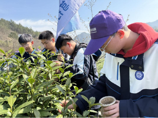研学队伍首站抵达悦溪茶谷,一场沉浸式采茶炒茶研学活动拉开帷幕。在茶农的悉心指导下,同学们手提茶篓,穿行于层层叠叠的茶园,指尖轻捻,采摘鲜嫩的茶芽与叶片,亲身感受“春收新茶”的劳动乐趣。同学们在茶垄间相互协作,你追我赶,现场气氛热烈而有序。