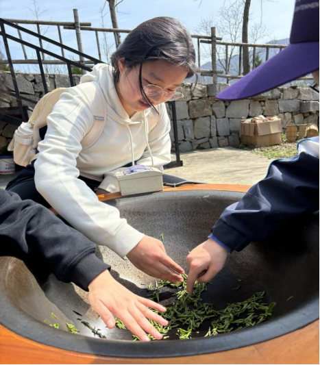 随后的炒茶体验环节,同学们围站在高温铁锅旁,学习茶叶杀青、揉捻等传统工艺。滚烫的铁锅中,茶叶在掌间翻动,氤氲的茶香袅袅升腾。同学们不仅掌握了制茶基础技巧,更在反复揉捻中体会到“一茶一叶皆不易”的朴素道理。正如纪录片《茶,一片树叶的故事》所展现的那般,一片小小的茶叶,承载着土地的温度与匠人的心血,也见证着农耕文明的智慧传承。