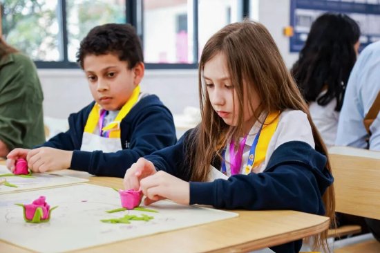 一起探索,他们的同桌是英国小孩。“自然+科学”实践课上,合作完成对不同形式“鸟巢”“猫捉老鼠”的研究、制作。如何用黏土与稻草固定?如何能按上马达让猫可以转圈捉住老鼠?摩擦力是什么?他们通过实验、讨论、思考、互助研究,让成品展现。课堂上,没有语言的交流障碍,有的只是彼此之间探索的精神存在。