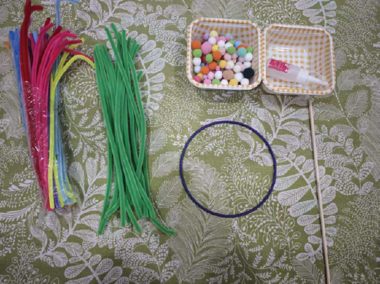 本次活动需要用到的材料有:毛根、塑料圈、毛球、酒精胶、木棍。
