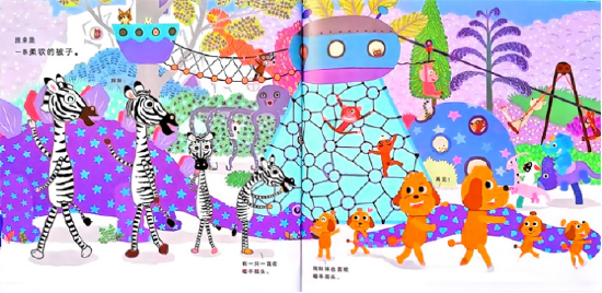 6只贵宾犬捧着有花纹的紫色礼物,从公园里的紫色滑梯前经过。他们带的是什么呢?
