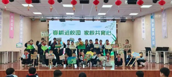 二年级、三年级、四年级的班级代表依次登台,手持精心制作的宣传牌,自信地介绍本班菜园主题、种植规划和班级农耕口号。一块块色彩鲜明、创意十足的宣传牌,承载着孩子们对土地的热爱与期待。展示结束后,全体代表在台上合影留念,定格下这份智慧与童趣交融的美好瞬间。