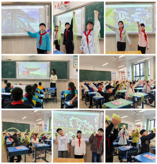 音乐学科以欣赏春晚歌曲《立春》为主线,以立春节气为切入点展开教学。课堂以一段轻快的手势舞律动开启,教师引导孩子们用指尖轻柔舒展,模仿春草破土而出的稚嫩与倔强;用掌心缓缓开合,再现春花悄然绽放的惊喜瞬间;再让手臂如柳枝般轻扬,勾勒春风拂过脸庞的温柔,歌曲播放视频画面融合了学生自己拍摄的家乡美景、春日的写生、春衣的画作灯等原创背景画面,让孩子们通过真实情境画面总结呈现出本次课例“皖春”主题的情感升华,在肢体的起伏与流转中,孩子们切身体会到了春天“万物复苏”的节律与诗意。