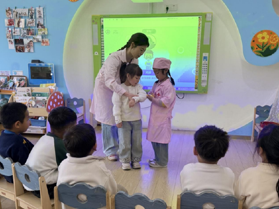各班教师结合幼儿年龄特点,用孩子们喜闻乐见的形式,生动传授接种前不紧张、接种时勇敢配合、接种后多喝水注意休息等预防接种小常识,引导孩子在轻松愉快的氛围中掌握科学的健康防护技能。