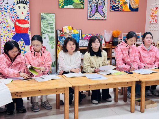 在教研B组中,教师以 “立春・点染迎春花” 为主题,通过试教展示、听课研讨、教案优化、推广实施等环节,精准把握小中大班幼儿发展特点,掌握美育分层设计逻辑与 “导入 — 示范 — 创作 — 评价” 教学流程,完善节气美育备课范式,让幼儿在创作中感受春日之美。