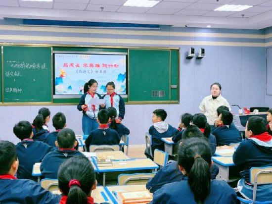 活动伊始,卜欢欢老师带来了五年级下册整本书经典阅读分享课《西游记》。卜老师精心设计多元课堂环节,首先带领同学们为《西游记》经典名场面进行趣味配音,让书本里鲜活的人物形象跃然眼前;接着鼓励学生上台自主分享书中印象深刻的西游故事,在讲述与交流中碰撞阅读感悟;最后组织学生集体观影思辨,围绕孙悟空一路的修行蜕变,深入探讨人物的成长与心性变化,引导同学们读懂经典背后的精神内核。