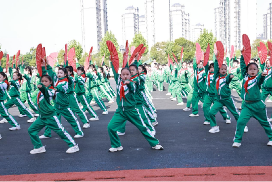 二年级同学们带来古诗联诵、儿歌谚语、课文回放与家规家训诵读,搭配舞蹈、手势舞、拍手节奏等形式,将《江南》《敕勒歌》《二十四节气歌》《神州谣》等篇目演绎得生动活泼、童趣盎然,在朗朗诵读中感受文字之美、传承优良家风;三年级同学以武术操诵《千字文》,用快板演绎《弟子规》,齐诵《增广贤文》,并串联《望洞庭》《早发白帝城》《元日》等经典诗词与四季课文,刚柔并济、节奏明快,让蒙学经典与诗词文赋焕发生机,展现扎实的诵读功底与良好的精神风貌;五年级同学融合花样跳绳、武术表演、钟馗画展示等特色元素,诵读《论语》名篇、家国诗词及《少年中国说》节选,气势昂扬、铿锵有力,将圣贤智慧、家国情怀与地方非遗文化有机结合,彰显“少年强则国强”的壮志豪情,将现场氛围推向高潮。