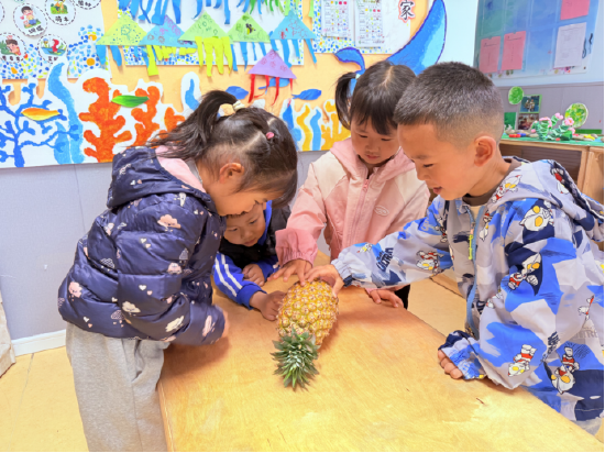活动中,教师以菠萝实物导入,引导幼儿观察菠萝的外形、色彩与纹理,激发创作灵感。随后,孩子们化身小小艺术家,用手指蘸取黄、橙、绿等色彩,以点彩的方式在画纸上勾勒出饱满的菠萝果实,再用画笔添画翠绿的叶子。稚嫩的指尖在画纸上轻点、晕染,每一个色彩斑斓的菠萝,都是孩子们天马行空的想象与创造力的展现。