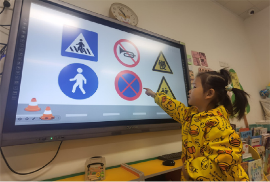 中班通过绘本故事、儿歌律动和互动问答的形式开展交通安全启蒙活动。老师们用通俗易懂的语言讲解了常见的交通标志,如“禁止通行”“注意行人”“人行横道”等,并结合动画短片,向孩子们展示了在马路上追逐打闹、随意横穿道路的危险性。