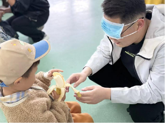 伴随着轻快的音乐,热身操与亲子互动游戏《口香糖粘哪里》迅速点燃了现场气氛,家长和孩子们跟着音乐做着趣味动作,欢声笑语连成一片。接下来,《双圈接力》《蒙眼喂香蕉》《套大鹅》等丰富有趣的游戏依次开展,孩子们和家长默契配合,在一个个关卡中挑战自我,每通关一个游戏就能收获一枚印章,孩子们拿着集章卡,脸上满是成就感。
