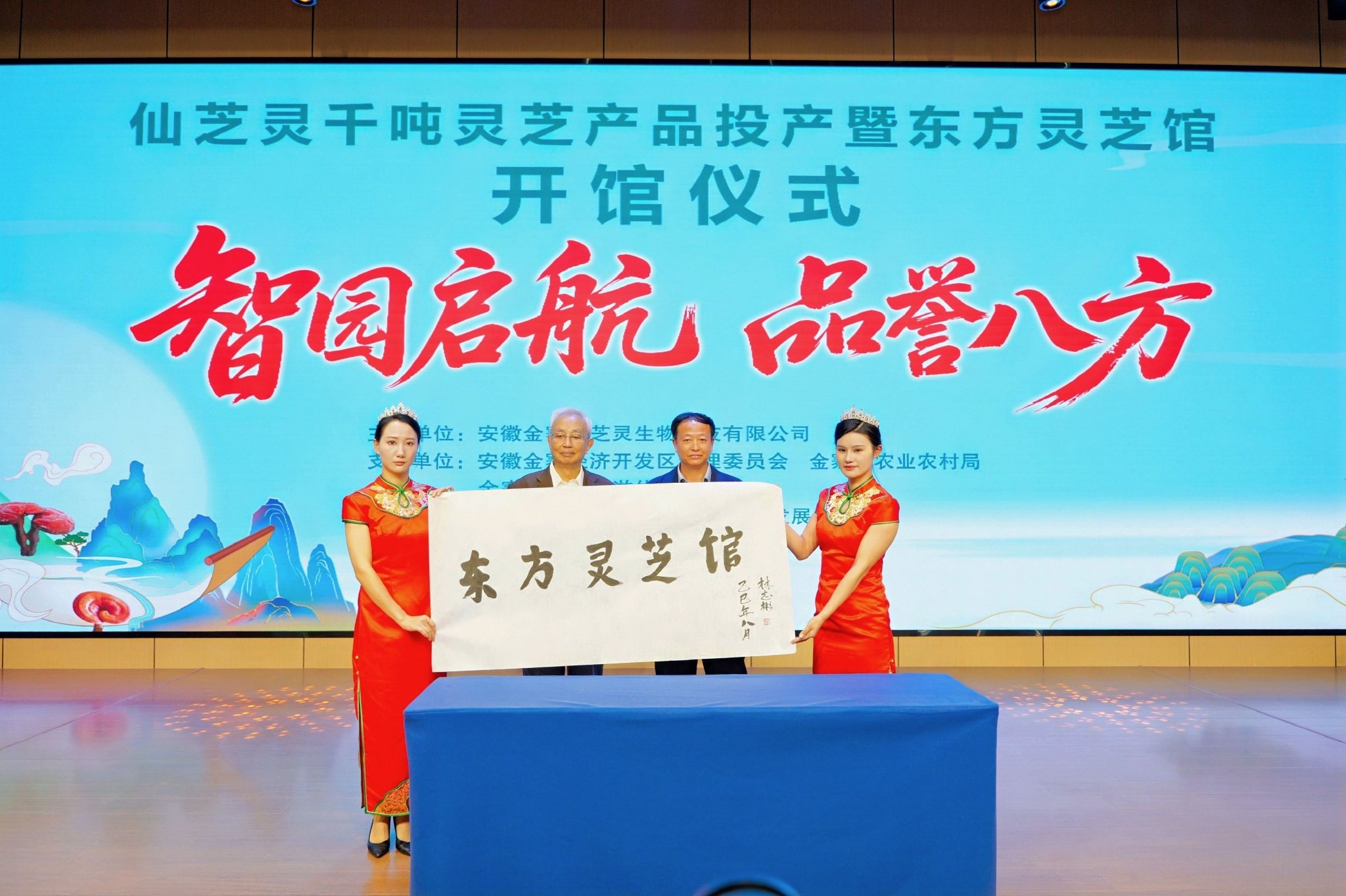 仪式现场,舞狮暖场氛围热烈。金寨县委副书记刘瀚宇在致辞中指出,灵芝产业是金寨践行“生态优先、绿色发展”的支柱产业,仙芝灵千吨产能投产与东方灵芝馆开馆,既是企业转型升级的重要一步,更是金寨塑强“金寨灵芝”品牌、助力乡村振兴的生动实践,将为县域经济高质量发展注入新动能。仙芝灵董事长黄守文介绍,公司深耕灵芝产业38年,此次新产能与展馆落地,将进一步打通“种植-研发-生产-销售-文化”全产业链,带动更多农户共享产业红利。江苏安惠生物董事长陈惠、北京垦荒人集团董事长张洪江等特邀嘉宾,从行业协同角度肯定了金寨灵芝的品质优势,提出将深化与仙芝灵的合作,共同推动“金寨灵芝”走向全国乃至国际市场。国际灵芝研究学会主席、北京医科大学教授林志彬现场题字“东方灵芝馆”、分享灵芝科研成果,为产业发展提供学术支撑;随后12位嘉宾共同参与“瑞狮点睛”与投产开馆启动仪式,标志着仙芝灵新产能正式落地、东方灵芝馆对外开放。