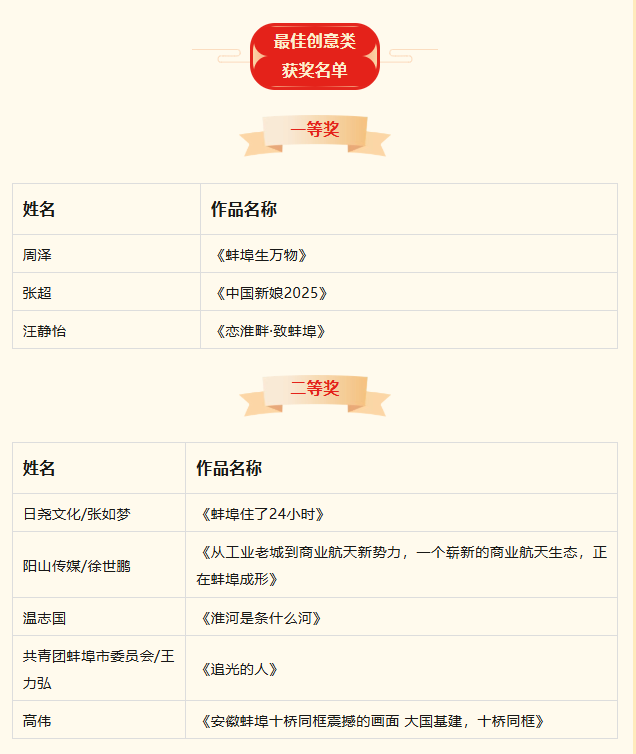 关注为深入贯彻落实市委、市政府关于网络文明建设的工作部署,充分发挥自媒体在传播正能量、弘扬主旋律中的积极作用,近期,我市开展了“自媒扬新风 蚌发好故事”2025年蚌埠市网络文明建设优秀短视频作品征集活动。活动自启动以来,全市广大自媒体人士积极响应,用镜头讲述蚌埠故事、传播蚌埠声音、展示蚌埠成就,全景呈现幸福蚌埠的美食美景、历史文化和人文风情,征集作品220余件。经综合比选和专家评审,共评选出优秀传播类、最佳创意类和重大主题类获奖作品54件(具体名单见附件)。这些作品主题鲜明、内容丰富、形式新颖,充分展现了新时代蚌埠的发展风貌和自媒体人士的责任担当。壮大网上蚌埠声量,展现网上蚌埠好形象需要大家共同努力,希望大家继续聚焦蚌埠产业文化和温暖人心的故事,用镜头创作传递更多温暖人心、给人力量、催人奋进的好作品,我们也将常态化开展评比表扬,以城市之名,为您的努力站台、鼓劲!