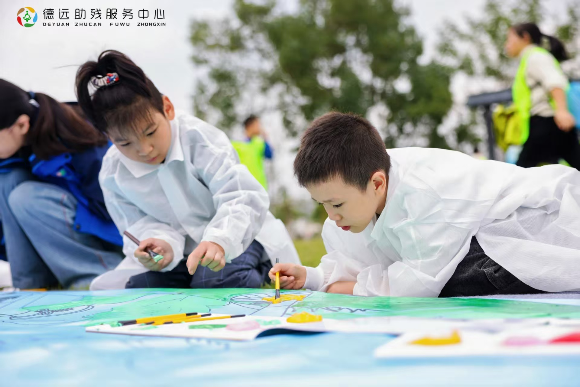糖画、捏面人等非遗工坊前围满了人,残障人士和市民一起动手,合作完成传统技艺作品。旁边的共绘长卷活动上,大家纷纷拿起画笔参与创作,一幅长卷在众人合作下慢慢画完。