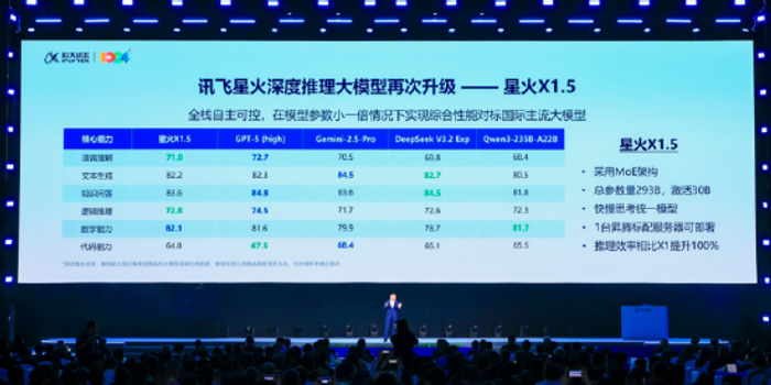 发布会上,深度推理大模型讯飞星火X1.5正式亮相。星火X1.5采用MoE架构,总参数量293B、激活30B,推理效率相比星火X1提升100%。它的语言理解、文本生成、知识问答、逻辑推理、数学能力、代码能力等六大核心能力全面对标国际主流,其中数学能力持续保持国际领先。其多语言能力覆盖超过130个语种,整体性能达到GPT-5的95%以上,其中拉美、东盟等14个重点语言效果领先,为世界提供了AI发展的“第二选择”。