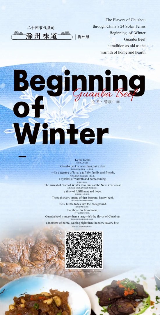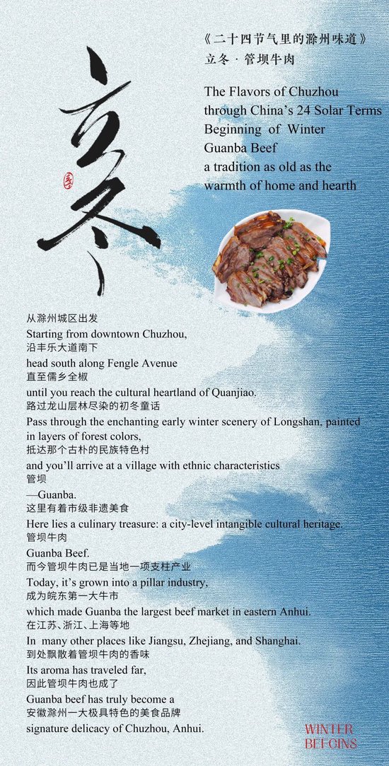 时值立冬,由中共滁州市委宣传部、市委网信办出品的《二十四节气里的滁州味道》立冬篇英文版正式上线,以滁州管坝牛肉为引线,串联滁州千年古县全椒的风物习俗,我们所传递的不只是美食,更是以国际语言向全世界推广滁州城市名片,让更多的海外游客读懂滁州、爱上滁州。