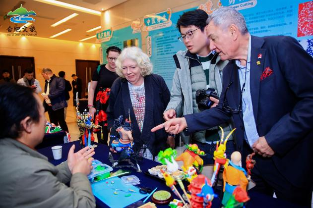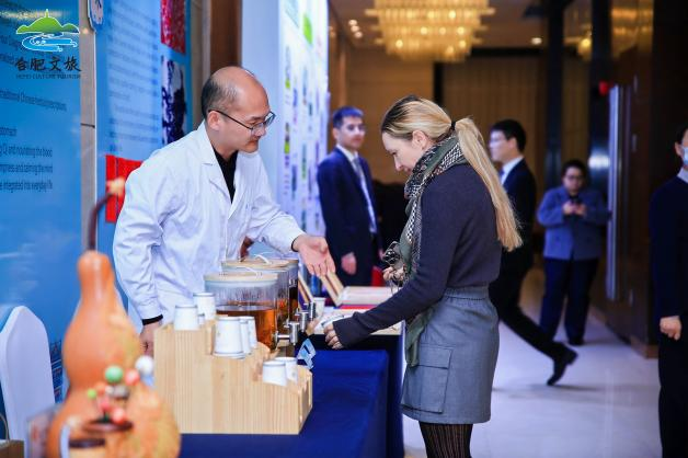 为展现安徽独特的地域文化,推介会精心安排了黄梅戏表演与非遗展示环节。《果然喜从天上降》《夫妻双双把家还》等经典黄梅戏唱段赢得满堂喝彩,令国际嘉宾沉浸于安徽传统戏曲的韵味之中。现场同步设置的非遗文创展区同样引人注目,面塑、剪纸、葫芦雕刻、脸谱彩绘等技艺现场展示,配以中医养生茶饮品鉴,吸引众多嘉宾驻足交流,以“动静相融”的形式,生动传递出江淮文化的艺术魅力与当代活力。