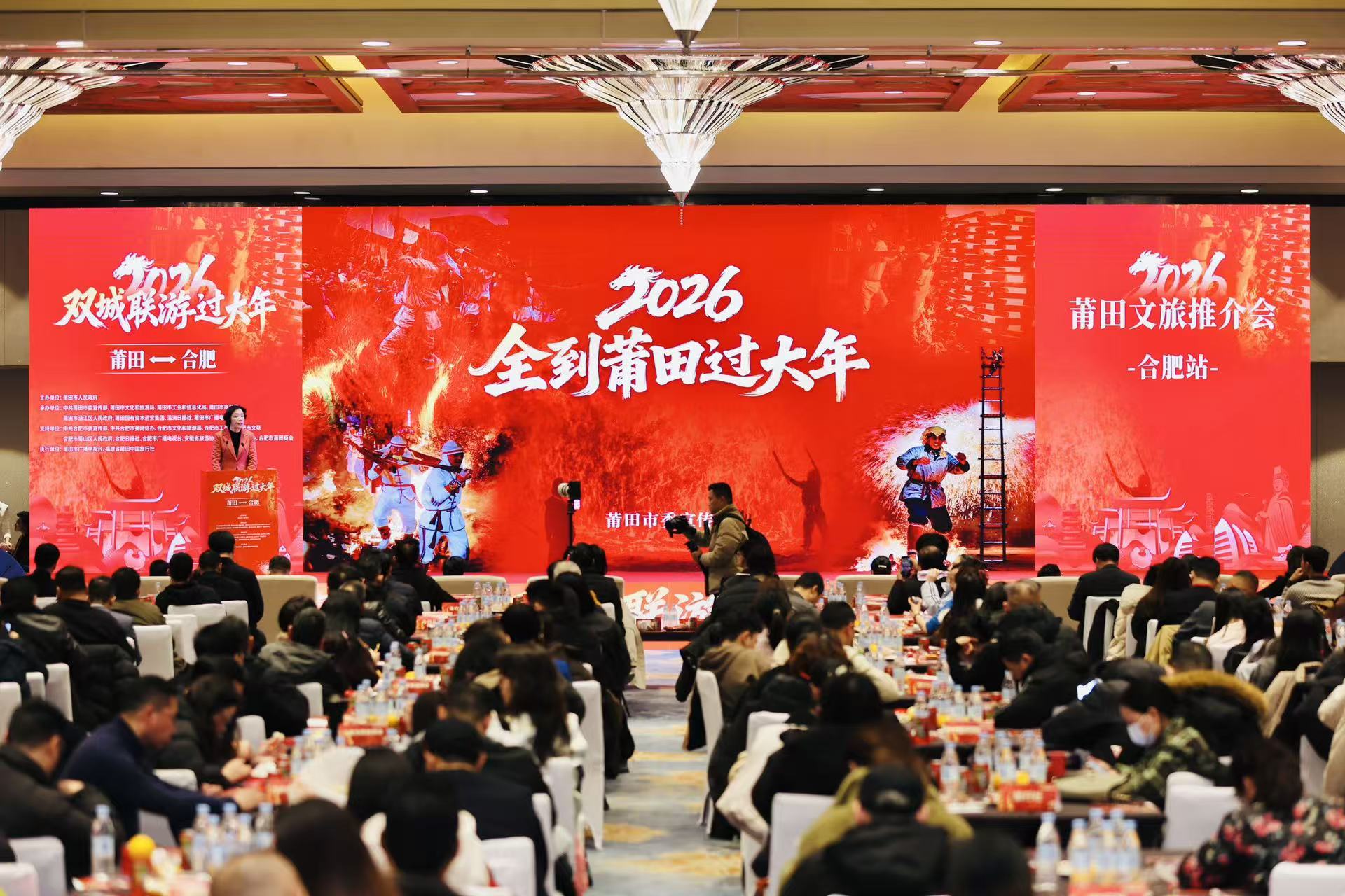 莆田市委常委、宣传部部长陈惠黔在推介时表示,希望以此次“双城联游过大年”活动为契机,学习好合肥在文旅多元融合、业态创新、品牌推广等方面的先进经验,推介好莆田历史和文化,宣传好本次推介活动,吸引更多游客走进两地、感受双城的独特魅力。她介绍,今年农历正月初四,莆田做大岁过大年,全市所有酒店为入住游客免费提供年夜饭,同时还赠送包括莆田优品在内的新春大礼包,当天乘坐公交车全城免费;今年春节元宵期间,莆田还将全面开放商圈、景区周边机关、企事业内部车位,对外地来莆车辆因不熟悉路况产生的轻微交通违法,原则上不予处罚。同时,莆田筹备了一系列丰富多彩的民俗文旅活动,包括农历正月初三至初九在全市各大公园举行莆田元宵民俗集中大展演、在城区绶溪公园举办为期一个月的“打铁花”表演、“千灯秀”闹元宵等,“年味”滚烫浓烈、精彩纷呈。诚挚邀请合肥及全国游客,2026年正月,全到莆田过大年,体验最火热的元宵民俗,感受最地道的宋韵闽风,来一次全国独一无二的莆田“过年”!