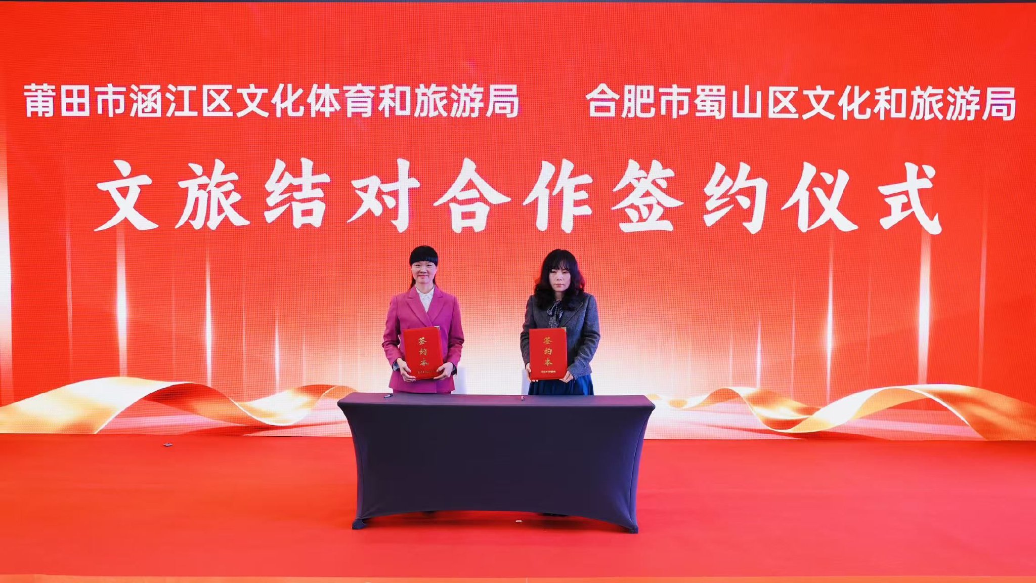 会上,三项文旅合作协议的签订成为双城深度合作的重要见证。莆田市文化和旅游局与合肥市文化和旅游局签订战略合作框架协议,双方将共同推进文化互鉴、旅游联动、宣传协同,包括共同举办妈祖文化与皖江文化主题交流活动、推动莆仙戏与庐剧互演、联合开发跨区域旅游线路等。莆田市涵江区人民政府与合肥市蜀山区人民政府签订战略合作框架协议,双方将在经济、文化、旅游、宣传等多领域建立常态化合作机制,通过资源共享、市场互动,推动两地经济社会协同发展。涵江区文化体育和旅游局与蜀山区文化和旅游局签订战略合作框架协议,双福计划聚焦“五色文旅”资源与“商科农文旅”融合资源的互补优势,联合推出 “海丝寻踪・科创体验”“绿色生态・田园风情” 等跨区域主题精品旅游线路,开展文化交流、人才互访等合作,协同提升两地文旅品牌的知名度和吸引力。