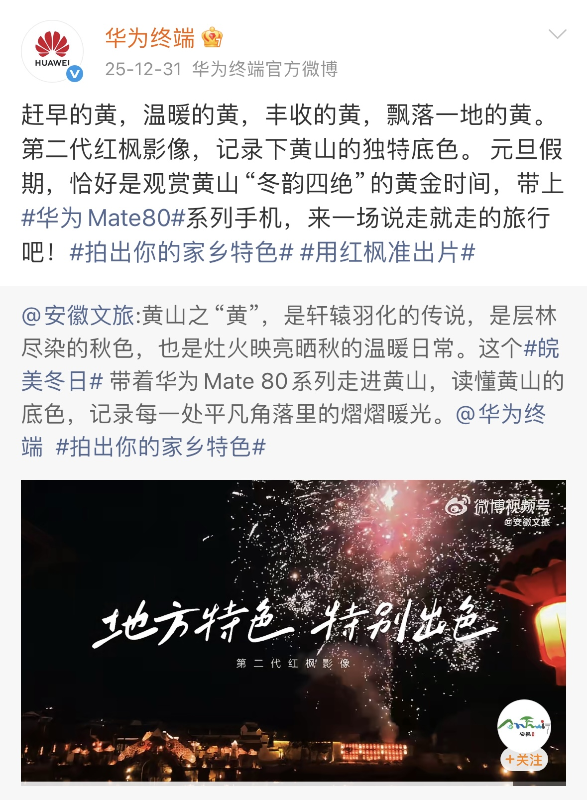 2025年12月,安徽文旅发布了一支全程由华为Mate 80系列拍摄并制作的聚焦安徽瞻淇鱼灯非遗IP,讲述“代代守护、薪火相传”的专题短片。该片于2025“徽韵流芳”国家级文化生态保护区交流活动中完成首发,标志着以科技助力非遗焕新迈出关键一步,也为“便携影像+文化传承”提供了可复制的实践范本。