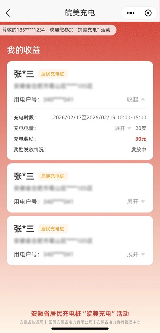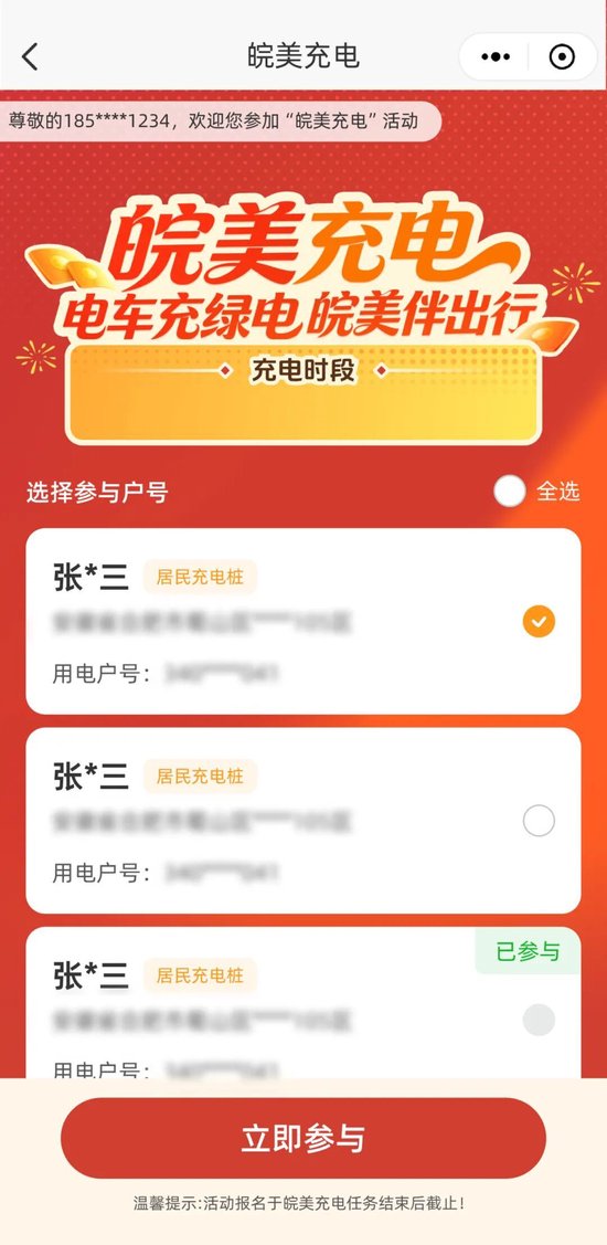 1、居民充电桩用户可在“国网安徽电力”微信服务号“皖美充电”活动页面,选择户号报名参与活动,活动结束前均可报名参与;