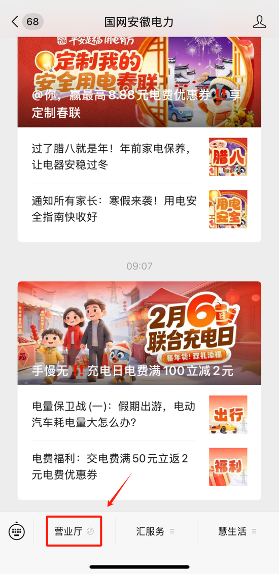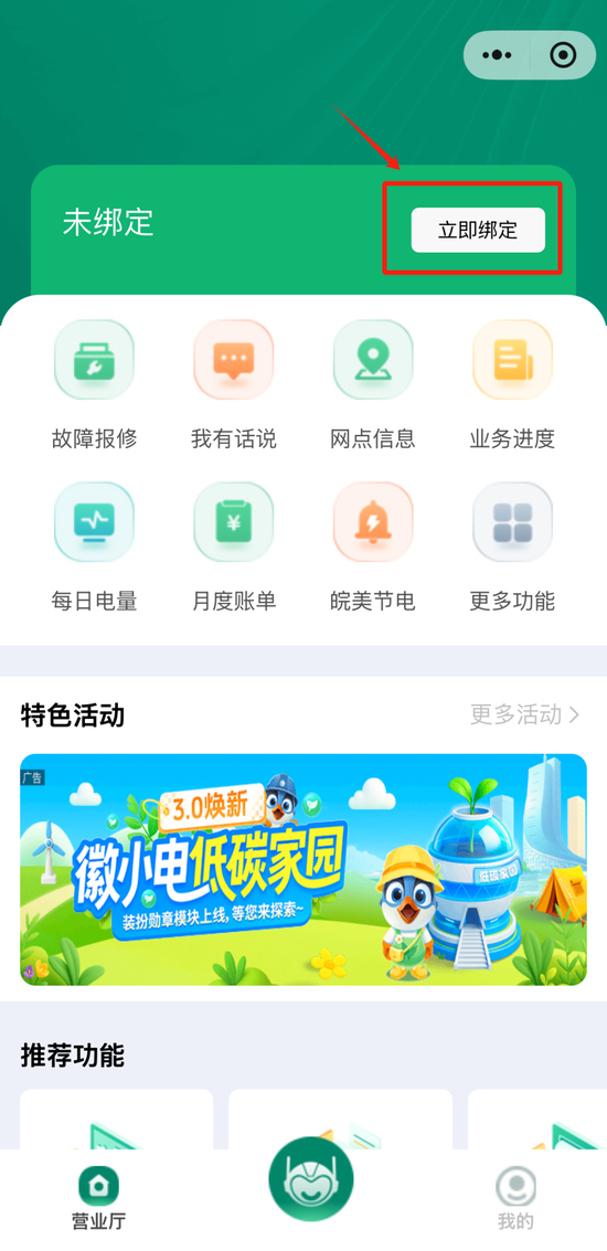 在服务号菜单栏-点击[营业厅]进入“国网安徽电力”小程序首页-点击[立即绑定]