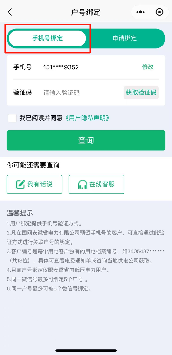 方式一:手机号绑定。通过在供电公司登记预留的手机号+验证码查询户号,选择需要绑定的户号,完成户号绑定。