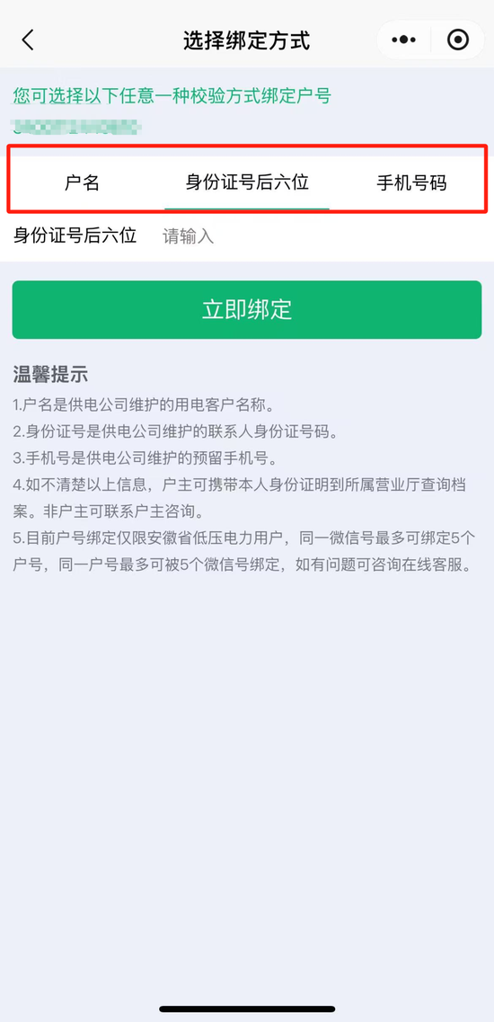 方式二:申请绑定。手动填写户号,并选择以下任意一种校验方式,完成户号绑定:用电户名、在供电公司维护的联系人身份证号后6位、在供电公司预留的联系人手机号。