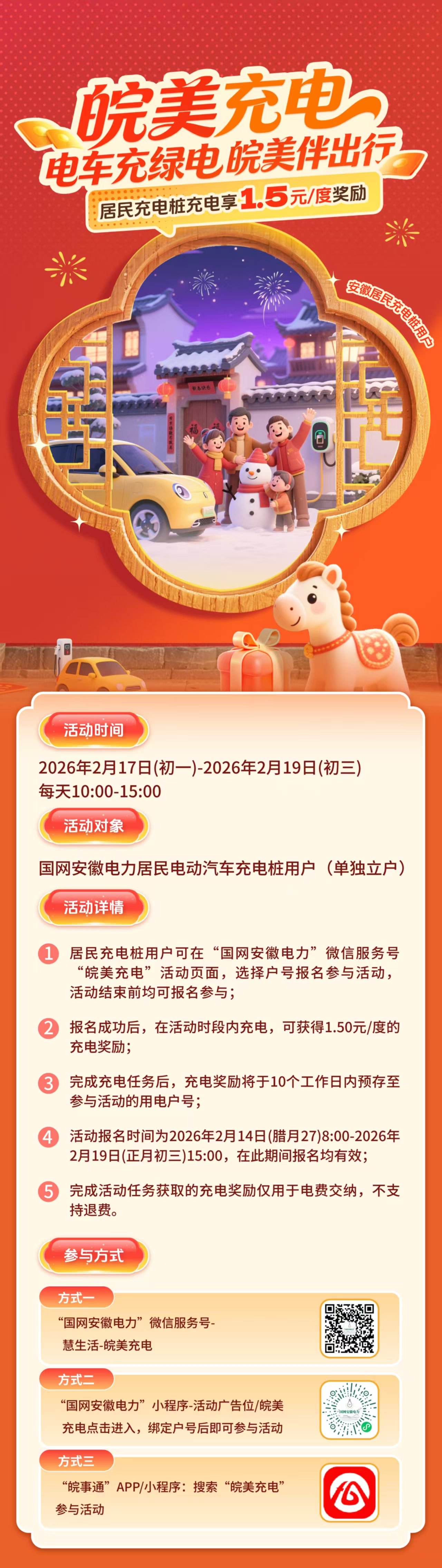 春节归乡路,满电更从容。国网安徽电力送上新春福利,充电享1.5元/度电费奖励,把安心带在路上,一路畅行奔赴团圆。