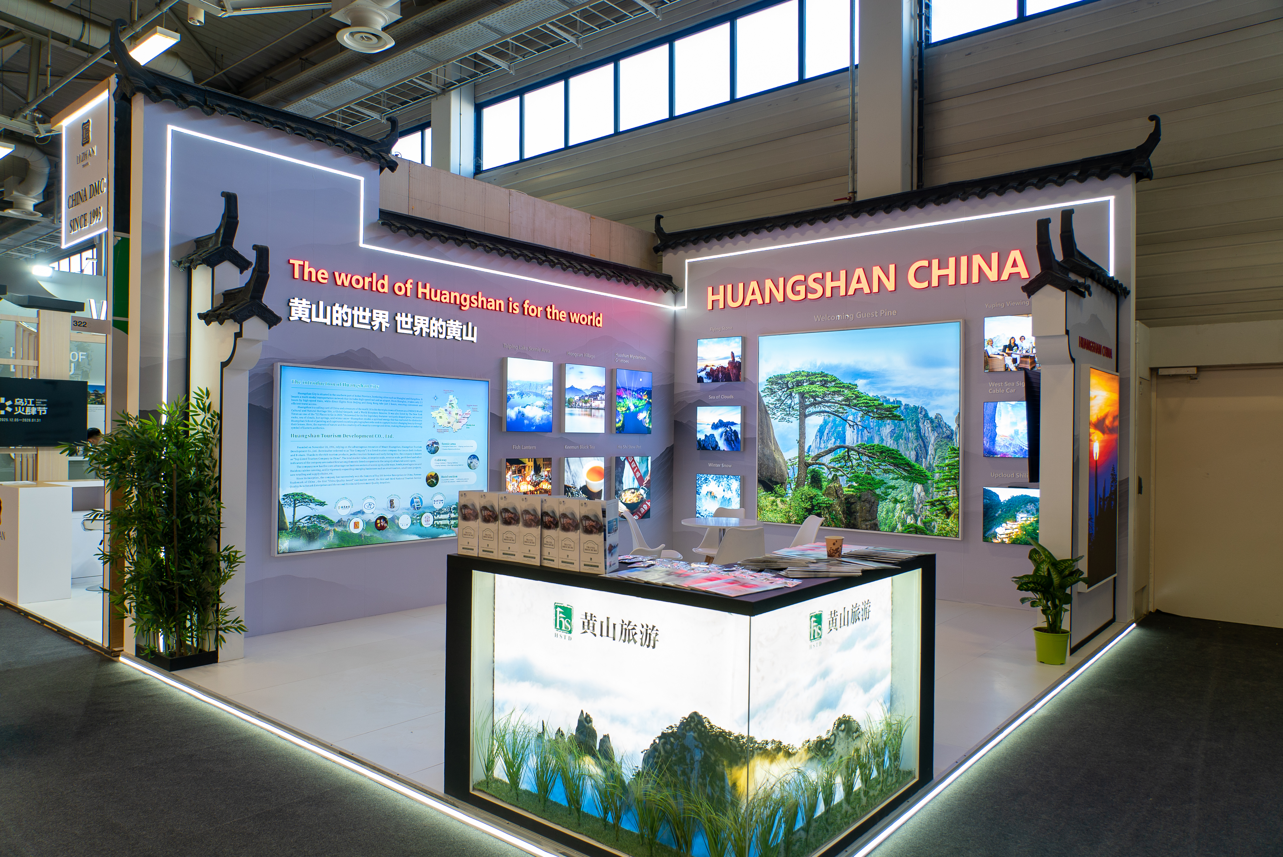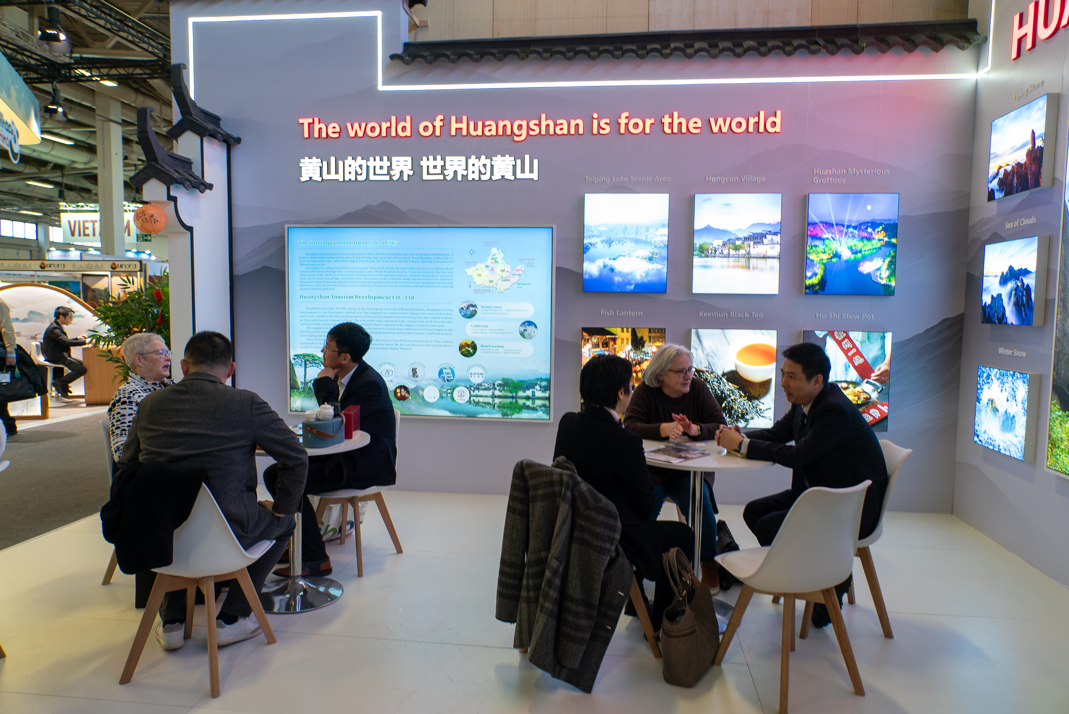 除了活态的非遗展示,黄山绝美的自然风光与焕新的旅游业态也成为展台焦点。通过巨幅背景图片,一幅兼具东方美学与现代质感的山居生活图景徐徐展开:从黄山奇绝的松石云海,到隐匿山巅的高端美宿“雲亼·狮林崖舍”——这座融合了徽州人文意蕴与当代设计美学的山居,正吸引着越来越多追求深度体验的境外旅行者。