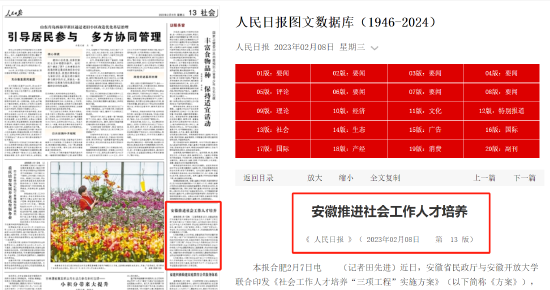 2022年,学校与省民政厅合作共建安徽民政开放学院,搭建基层社工能力提升平台,实施学历提升、持证率提升和实务能力提升“三项工程”,推动学历提升与岗位需求同频共振,累计招收培养社会工作者学员4613人。被人民网、安徽日报等主流媒体报道。