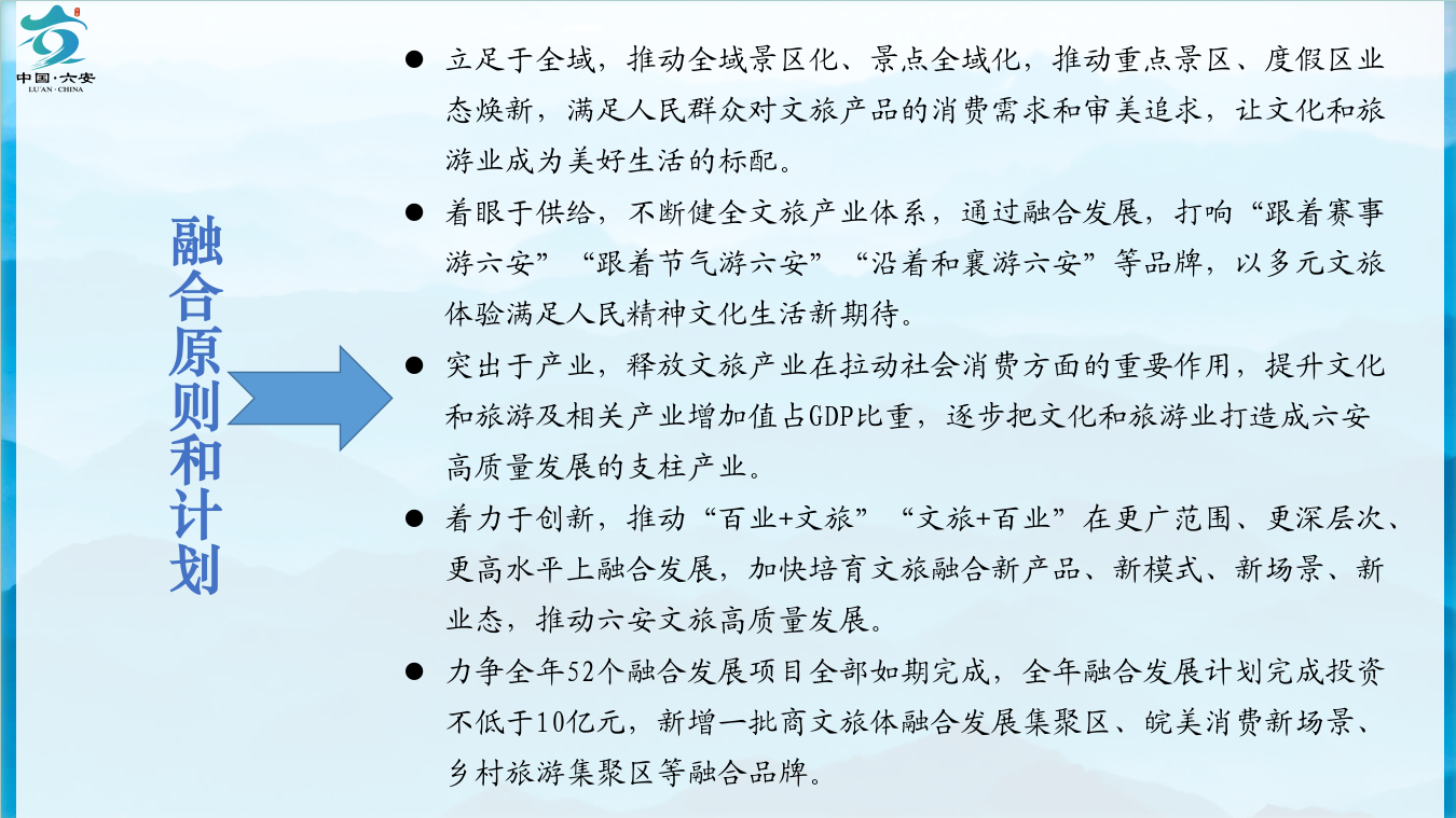 通过系统谋划、分类推进,六安市力争全年融合发展项目全部如期完成,新增一批商文旅体融合发展集聚区、皖美消费新场景、乡村旅游集聚区等融合品牌,持续释放文旅产业在拉动社会消费方面的重要作用。