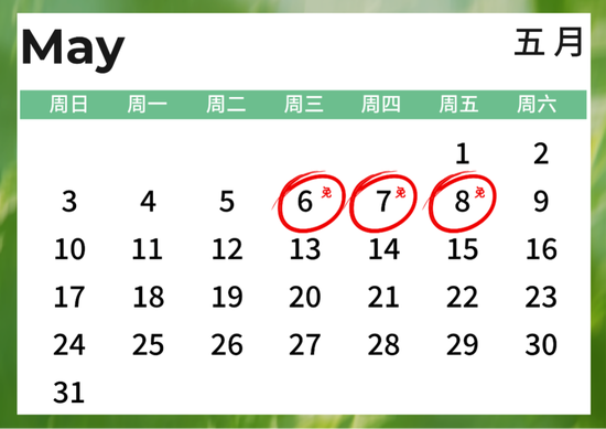 2026年4月1日至4月3日、4月7日至4月9日、4月28日至4月30日、5月6日至5月8日,共12天。