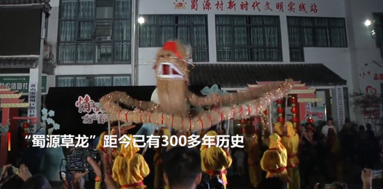 “蜀源草龙”距今已有300多年历史,龙身以稻草为主要材料,辅以毛竹做支架,制作过程中采用编、插、嵌、镂等十多种工艺,成型后的“草龙”由数万根稻草编成,身长达13.6米,在“草龙”舞动时全村家家户户都要迎敬草龙。